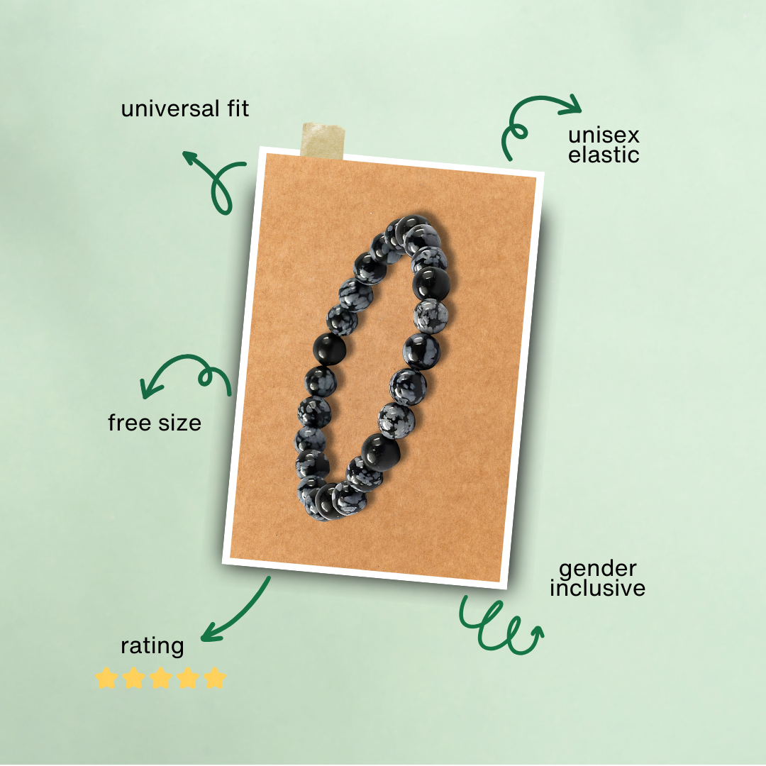 The Snowflake Obsidian in the bracelet helps to bring a sense of calm and tranquility, making it a powerful aid for reducing stress and anxiety. It encourages emotional healing by helping to release negative thought patterns and past traumas. The stone provides clarity and insight, allowing you to see situations more objectively and making it easier to make decisions. Snowflake Obsidian also works to balance the root and sacral chakras, promoting stability and grounding while enhancing your sense of personal power and security. It is a perfect bracelet for those who want to restore balance, self-confidence, and emotional well-being.