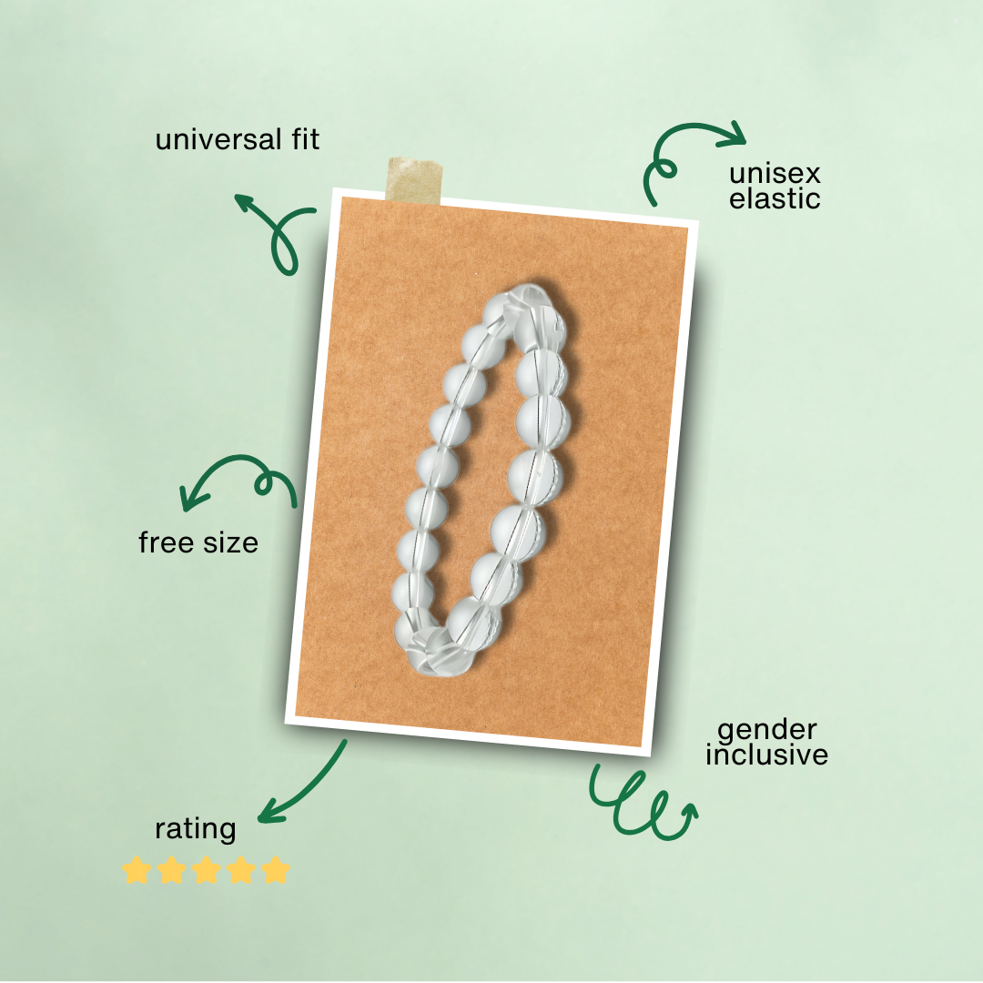The Sphatik Crystal Quartz Bracelet features natural, clear quartz beads that are highly regarded for their purity and healing properties. Known as the "Master Healer," Sphatik Crystal Quartz is considered one of the most powerful stones in the crystal world. It is believed to amplify energy, promote clarity of mind, and balance the body, mind, and spirit. This bracelet not only enhances your overall well-being but also serves as a stylish accessory that brings positive vibrations and clear intentions into your life. The clear, transparent beads of the Sphatik Crystal Quartz represent purity and are highly sought after for their ability to cleanse and enhance other stones' energies.